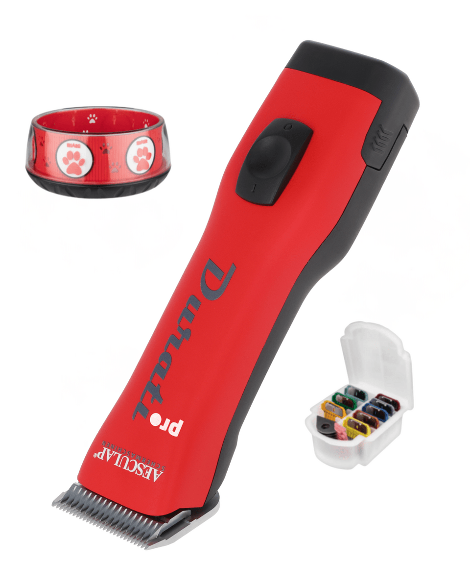 Bundle AESCULAP Hundeschermaschine Durati Pro rot inkl.2 Akkus+Size10 (1,5 mm) + Aufsteckkämme +Napf