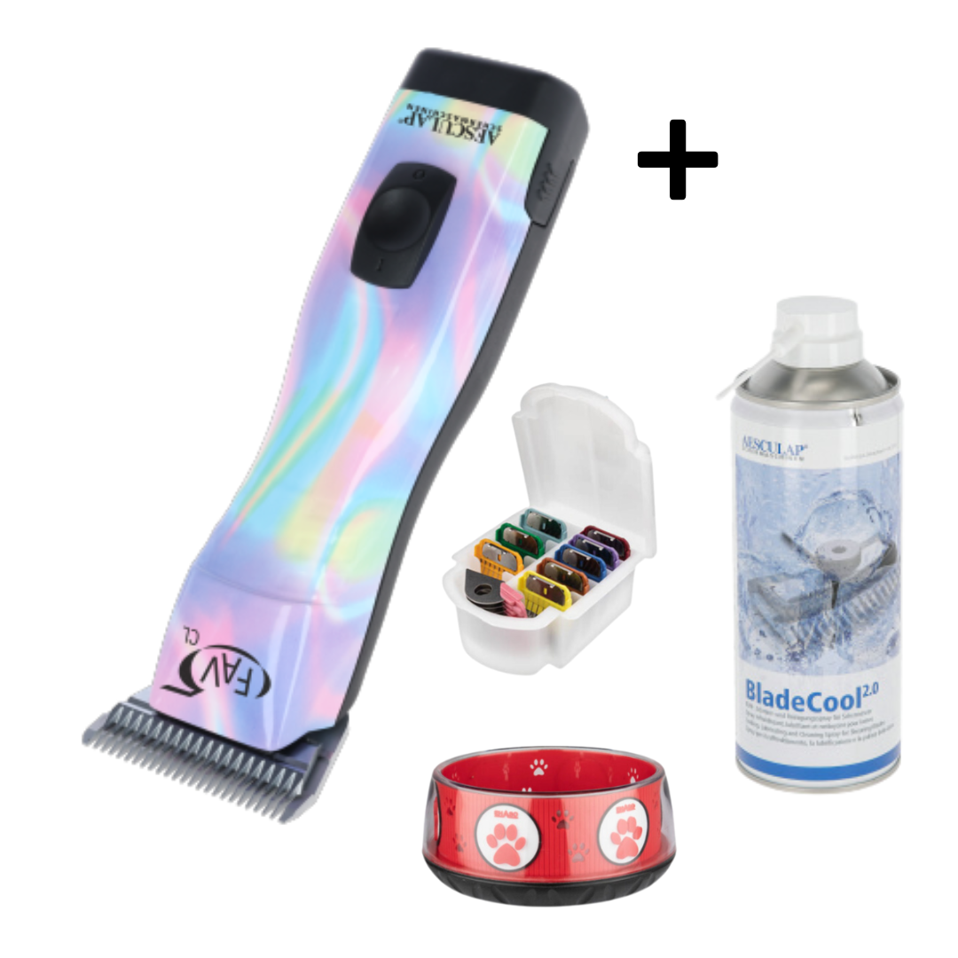 AESCULAP FAV 5 CL Horse Rainbow Schermaschine inkl. breitem Scherkopf #10WF (1,5 mm) + #10 (1,5 mm) + Aufsteckkammset 9 tlg. + Napf