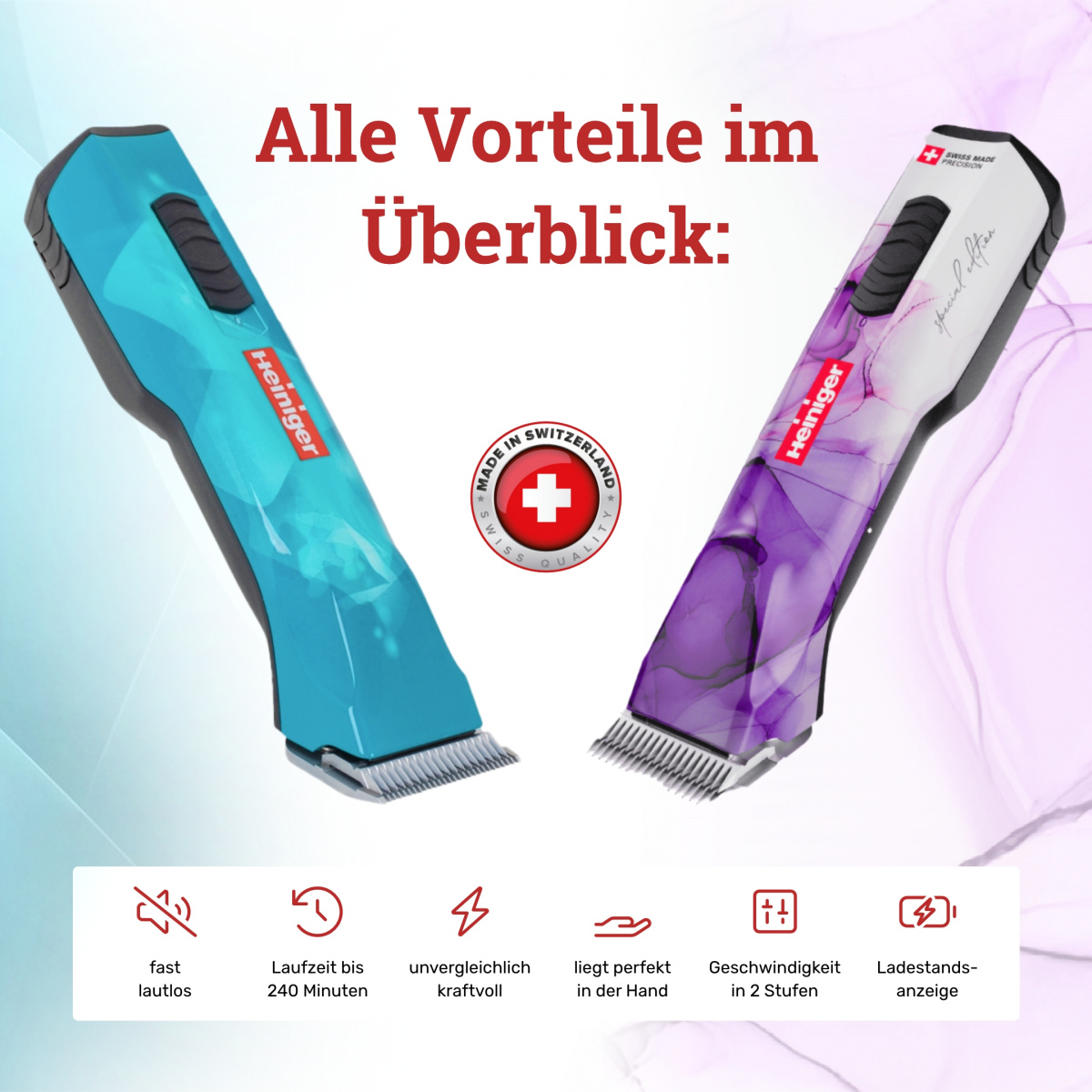 Die neue Schermaschine ist fast geräuschlos. Gleichzeitig ist sie unvergleichbar kraftvoll und verfügt über zwei Geschwindigkeitsstufen. Mit 3100 Doppelhüben pro Minute auf der zweiten Stufe (2600 auf der ersten) kann der Anwender mit Leichtigkeit zügig auch durch verschmutztes, dickes Fell und Haar gleiten. Jetzt im schicken Lila.