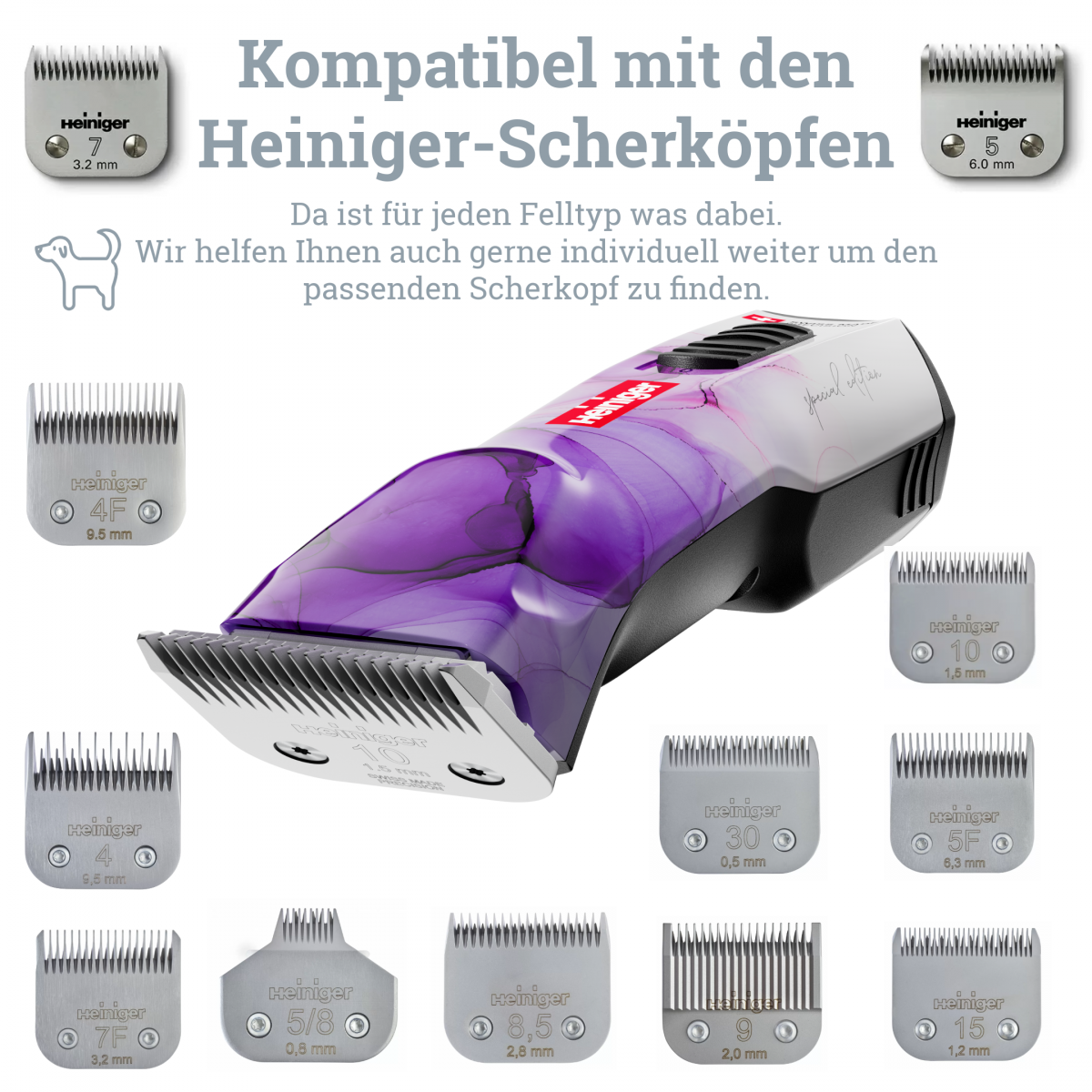 Auf die Opal passen alle SnapOn Scherköpfe von Herstellern wie Aesculap, Heiniger, Wahl, Oster, Moser und Andis.