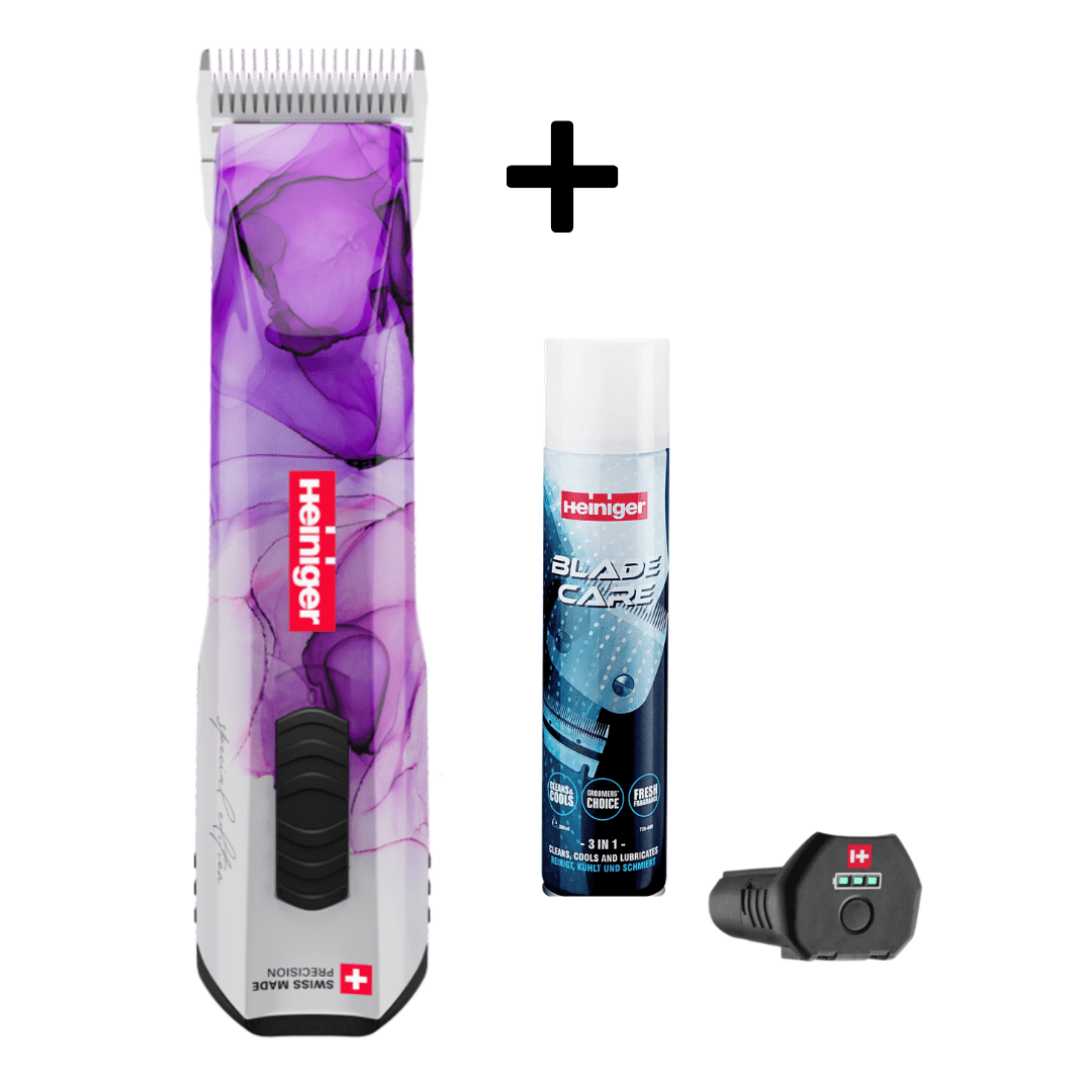 Die neue Schermaschine ist fast geräuschlos. Gleichzeitig ist sie unvergleichbar kraftvoll und verfügt über zwei Geschwindigkeitsstufen. Mit 3100 Doppelhüben pro Minute auf der zweiten Stufe (2600 auf der ersten) kann der Anwender mit Leichtigkeit zügig auch durch verschmutztes, dickes Fell und Haar gleiten. Jetzt im schicken Lila.