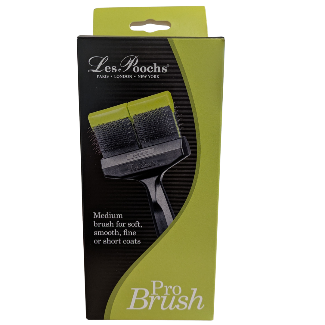 Die mittlere Bürste von Les Poochs Pro (grün) ist speziell dafür konzipiert, Unterwolle und abgestorbenes Fell sanft zu entfernen.