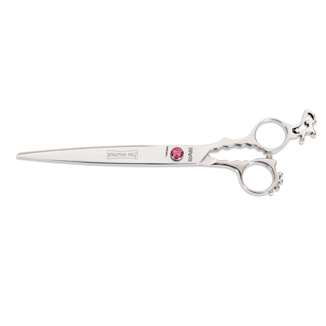 Ob gerade, gebogen oder als Modellierschere – REVOLUTION DOGZ steht für professionelle Qualität mit kunstvoll gearbeitetem DOGZ-Griff und Hundeapplikation.