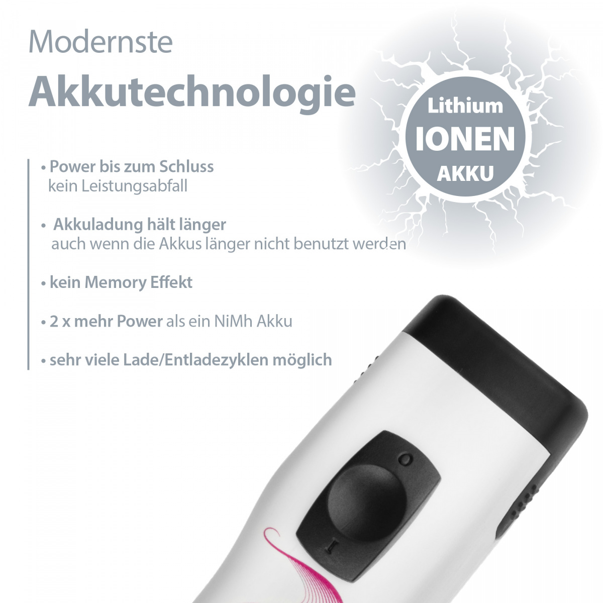- Lithium Ionen Akkutechnologie: Power bis zum Schluss, kein Memory Effekt, lange Lebensdauer und hohe Laufzeit von bis zu 240 min.
