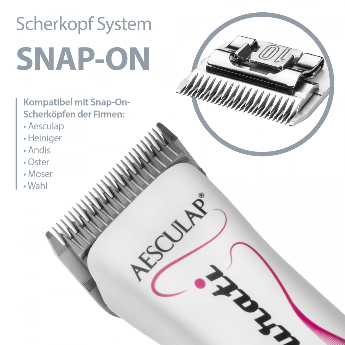 Auf die Durati Speed passen alle SnapOn Scherköpfe von Herstellern wie Aesculap, Heiniger, Wahl, Oster, Moser und Andis.