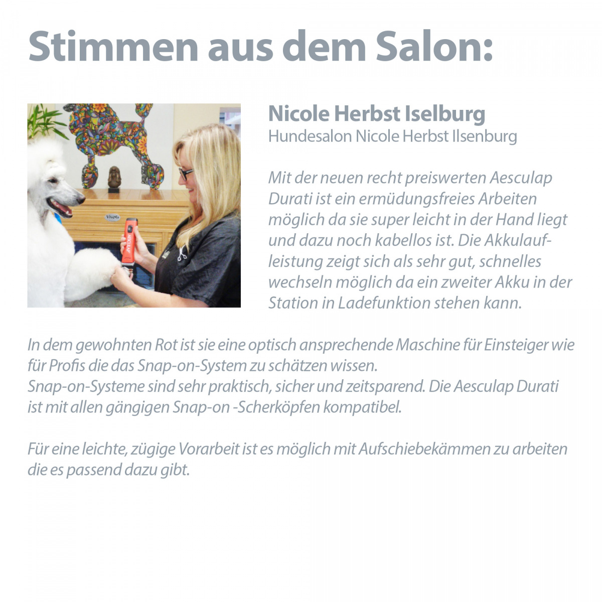 Für den professionellen HundesalonDie neue Kleintier-Akkuschermaschine „Made in Germany“ überzeugt durch bestes Preis-/Leistungs- verhältnis in bewährter Aesculap Qualität. Die Aesculap Durati besticht durch ihre Leichtigkeit mit nur 380 Gramm und dem ergonomisch geformten Griffbereich. Sie eignet sich besonders für sehr langes und gleichzeitig ermüdungsfreies Arbeiten.