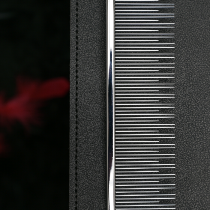 Die Edelstahlzinken sind fest in einem massiven Messingrücken verankert und gleiten mühelos durch das Fell. Sie heben und trennen das Haar für ein perfektes Scheren, Formen und Finishing. Ob für den Showring oder die tägliche Pflege – dieser Kamm bietet unvergleichliche Leistung und Komfort.