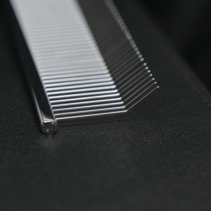 Der Precision Lift Comb zeichnet sich dadurch aus, dass er die Haarspitzen anhebt und sie perfekt für eine präzise Scherenarbeit positioniert. Die gebogenen Stifte ziehen das Haar sanft gerade und eignen sich daher ideal zum Formen von Haarknoten bei Pudeln, zum Anheben von schwerem Fell, das Struktur braucht, und zur Pflege von weichem Fell, dem es an natürlichem Volumen fehlt. So wird sichergestellt, dass selbst das schwierigste Fell perfekt gestylt, geschoren und frisiert werden kann.