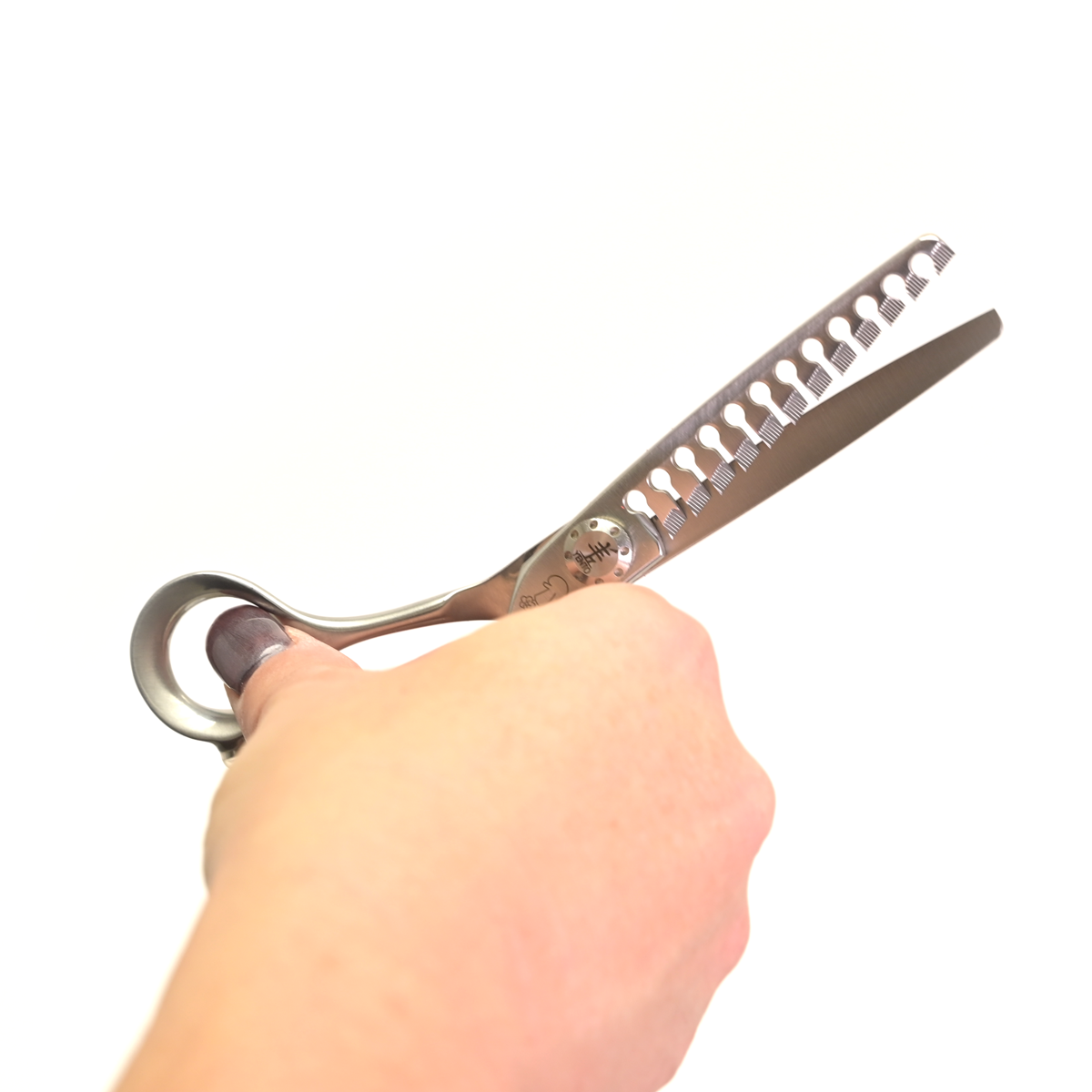 Diese Scheren eignen sich hervorragend zum Texturieren des Fells. Dank der groben Zahnung entstehen weiche Übergänge, die dem Fell eine natürliche Struktur verleihen. Sie sind ideal für die Bearbeitung von dickeren und gröberen Fellarten und sorgen für ein gleichmäßiges, professionelles Finish.