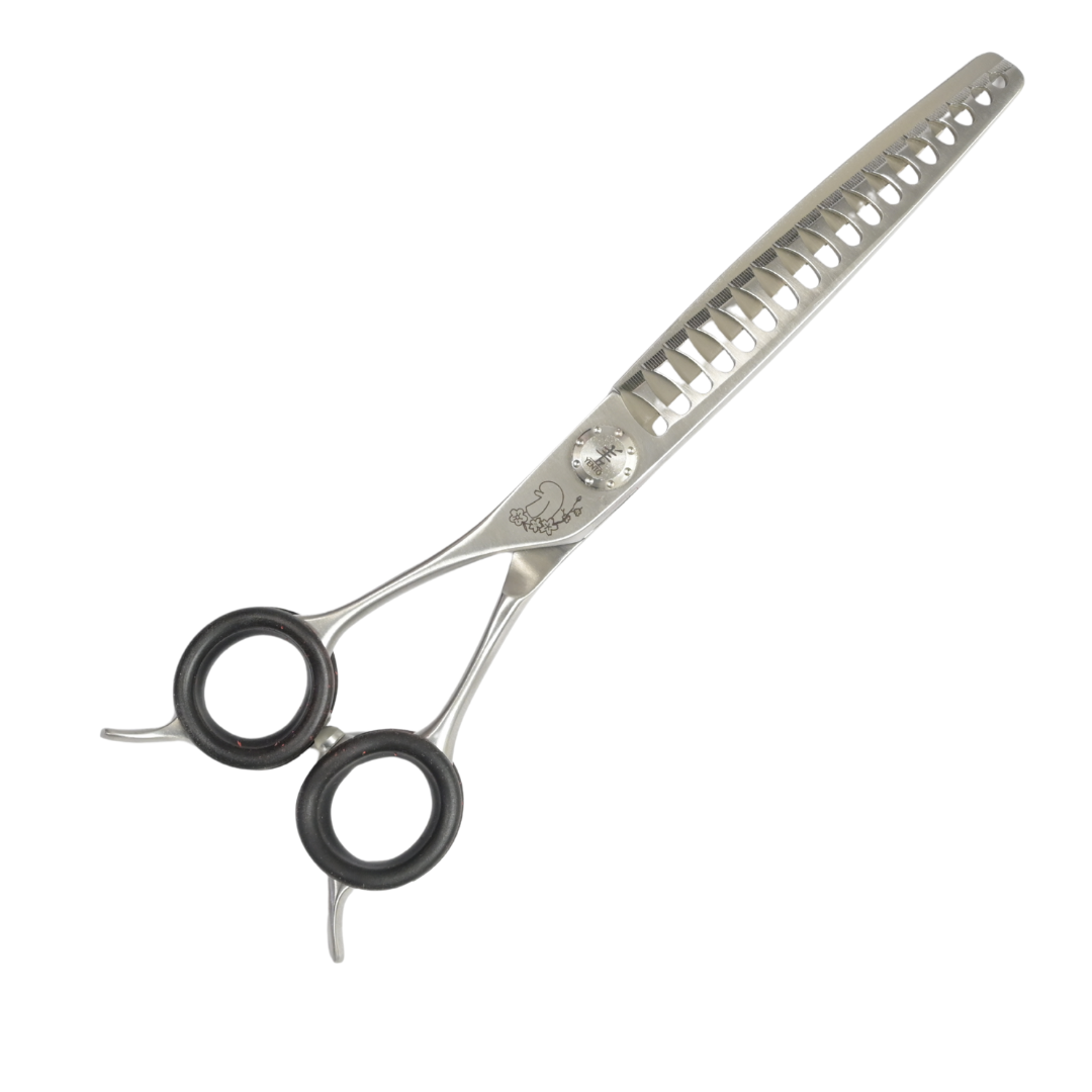 Darüber hinaus enthalten die Chunker eine Subversion der traditionellen Wellenschliffkante für besonders müheloses, scharfes und kraftvolles Schneiden. Jede Schere entfernt eine beträchtliche Menge an Haaren, was zu weniger Schnitten und weniger Kraftaufwand führt und so Ihren Pflegeprozess rationalisiert. Entscheiden Sie sich für die Yento Tanto Schere für ein Scherenerlebnis, das Komfort mit hoher Leistung verbindet, was sie zu einem Muss im Werkzeugkasten eines jeden Hundefriseurs macht.